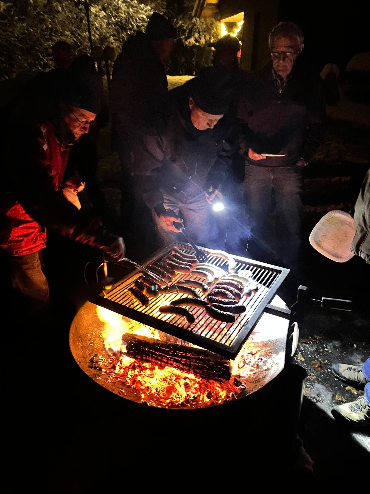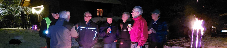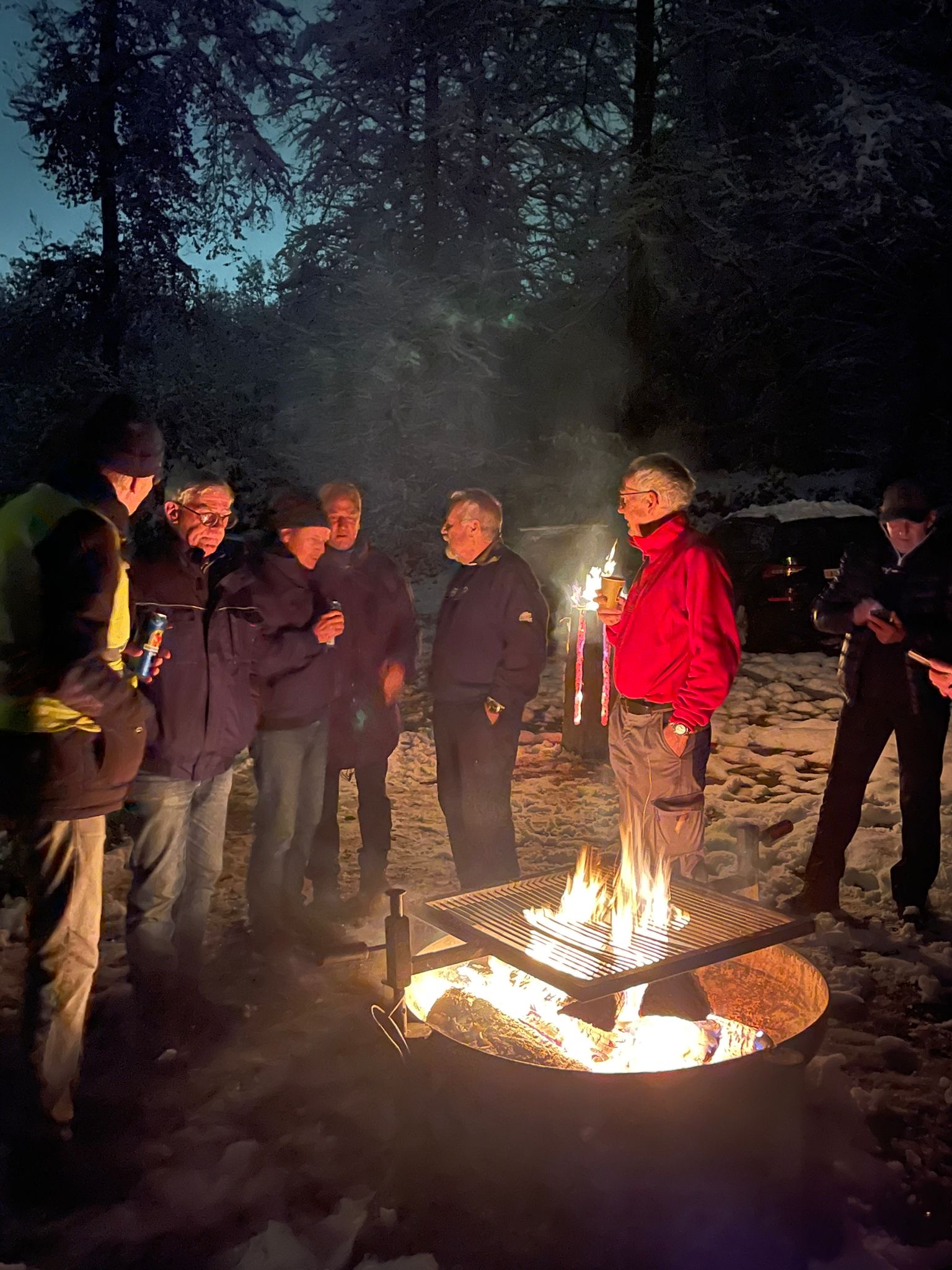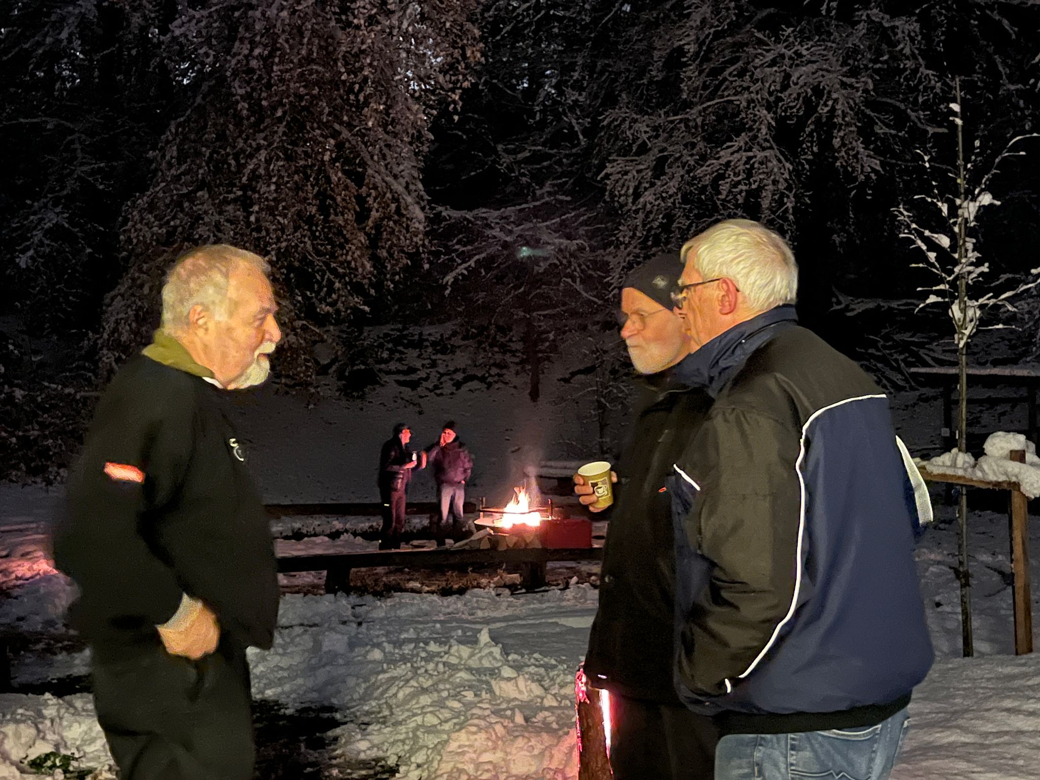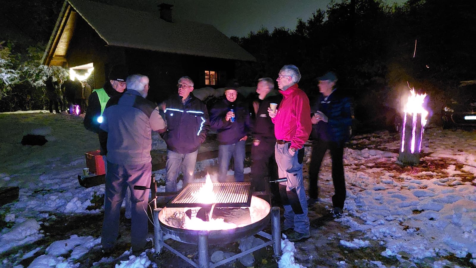 Als Dank für diese Einsätze lud der Vorstand die Helfer zu einem Waldfest bei der Schlossplatz-Hütte ein. Der reichliche Schneefall am Vortag sorgte für eine richtig winterliche Stimmung. René Keller und Walti Reinhard hatten ein grosses Grillfeuer und mehrere Schwedenfackeln angezündet, und ein Generator und Lichterketten sorgten bei der Outdoor-Küche für warmes Licht.