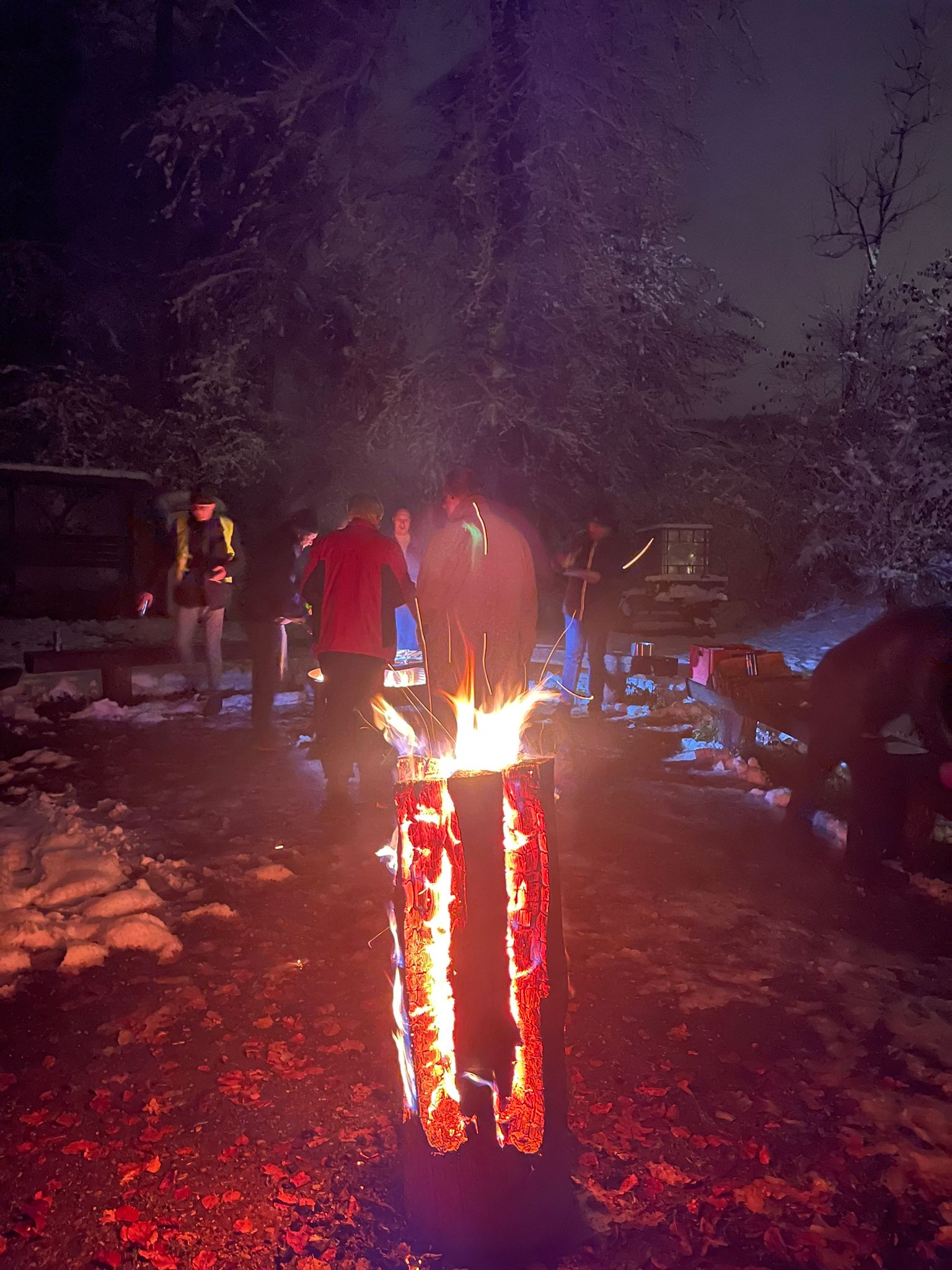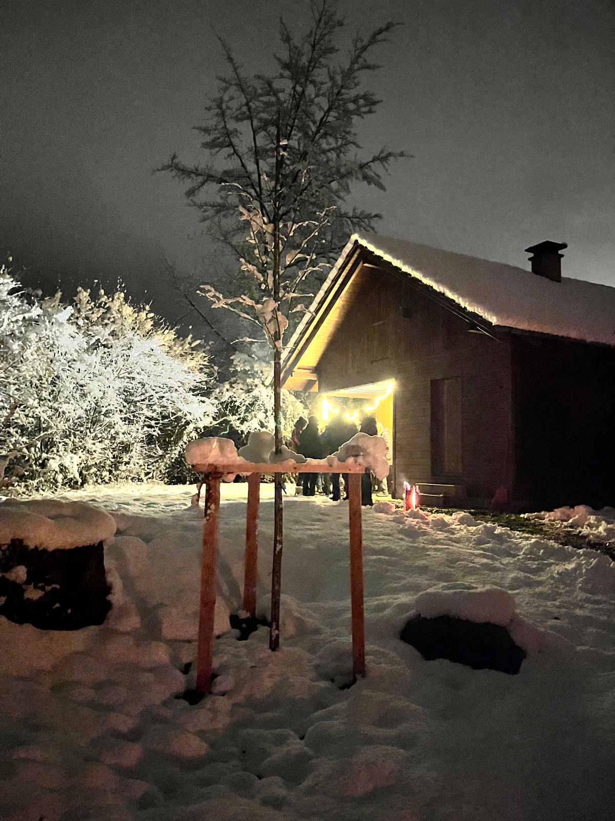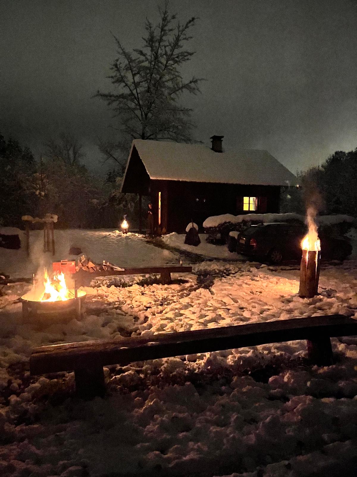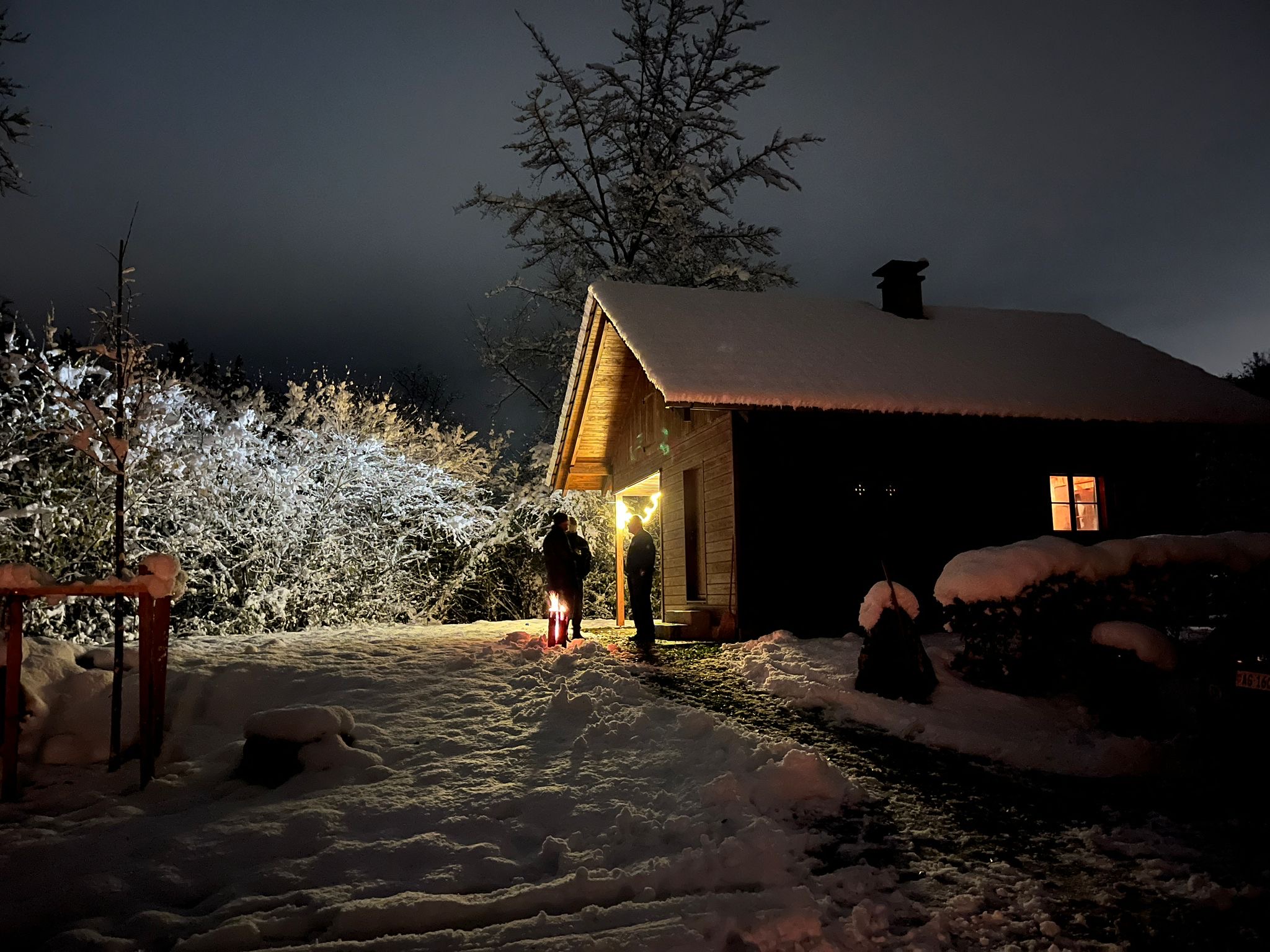 Als Dank für diese Einsätze lud der Vorstand die Helfer zu einem Waldfest bei der Schlossplatz-Hütte ein. Der reichliche Schneefall am Vortag sorgte für eine richtig winterliche Stimmung. René Keller und Walti Reinhard hatten ein grosses Grillfeuer und mehrere Schwedenfackeln angezündet, und ein Generator und Lichterketten sorgten bei der Outdoor-Küche für warmes Licht.