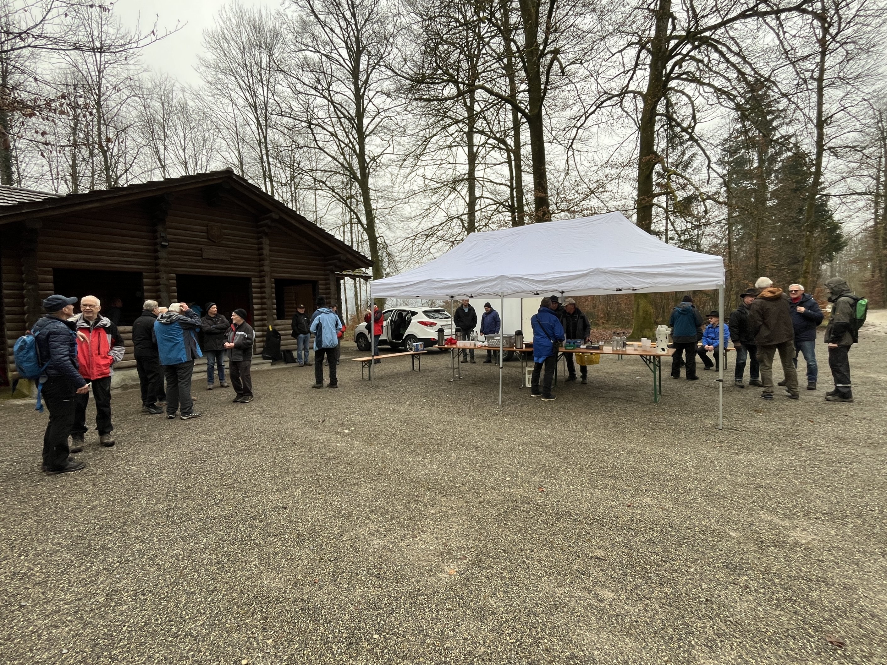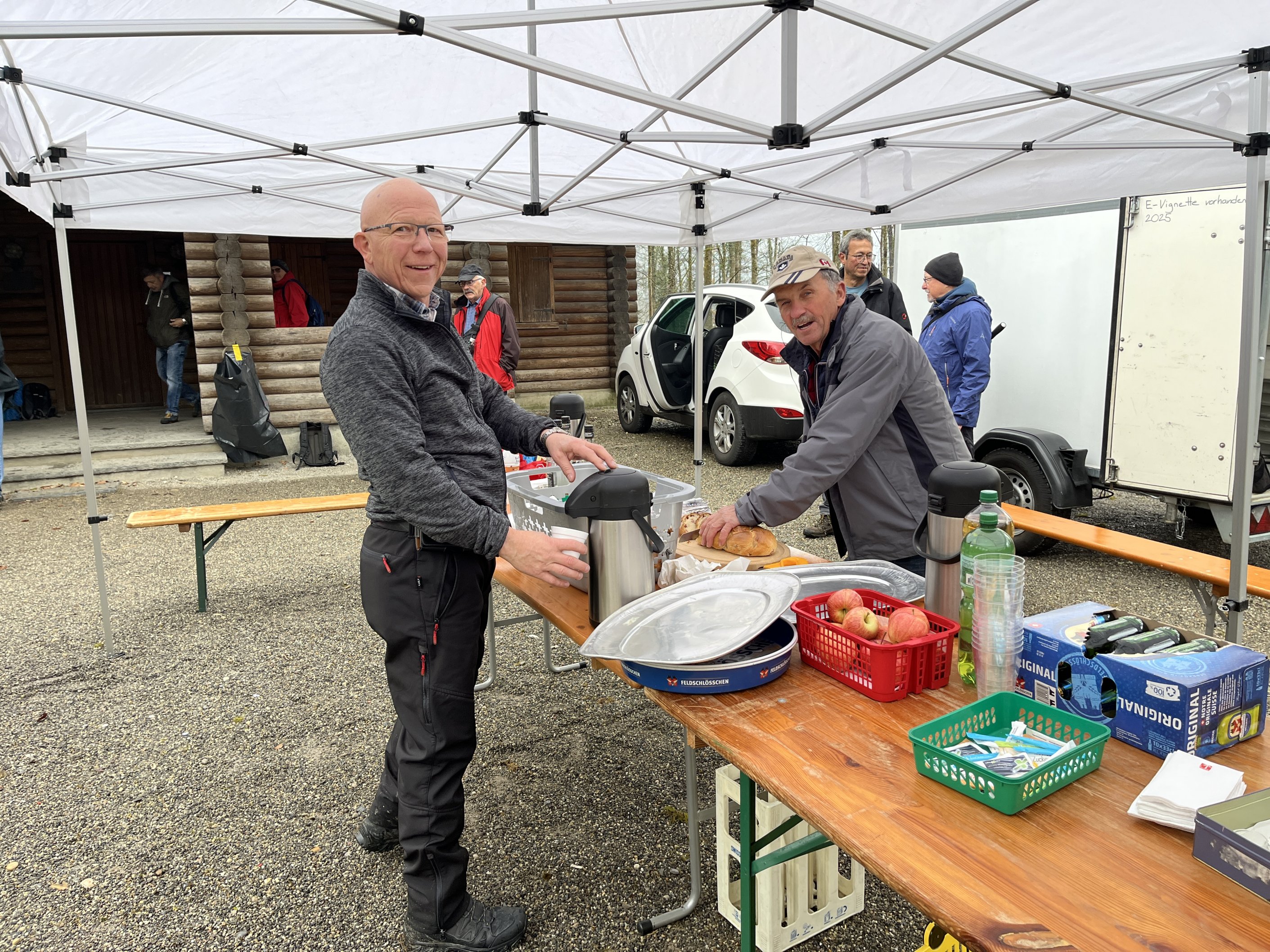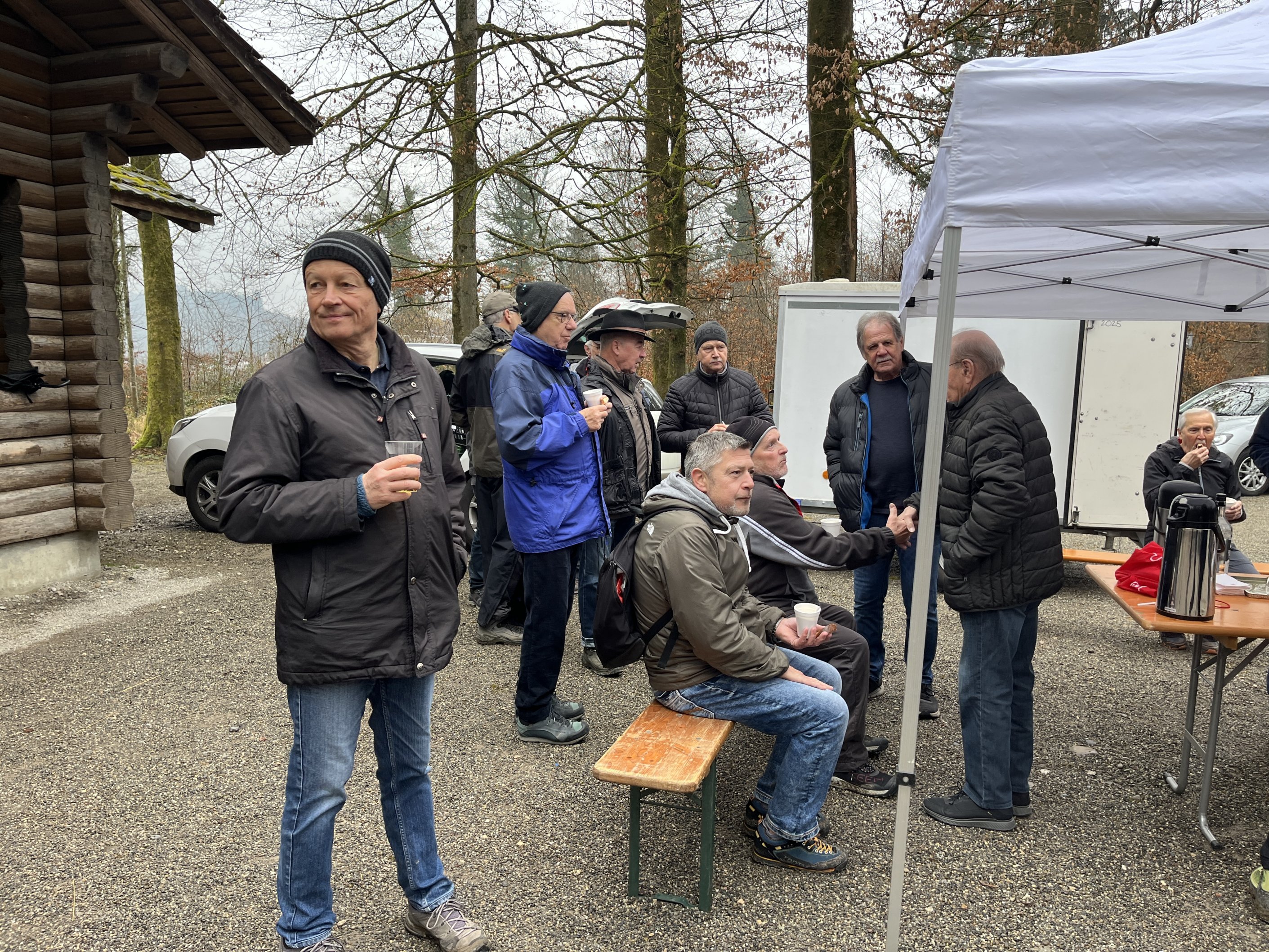 Aufgrund unserer ausgezeichneten Kondition, hierbei ein Dank an unsere Vorturner, sind wir etwas verfrüht dort eingetroffen. Empfangen von Waltis Helfermannschaft und dem Duft von warmen, selbst gemachtem Speckzopf, Kaffee und frischen Äpfeln haben sich weitere 14 Kollegen hinzugesellt.