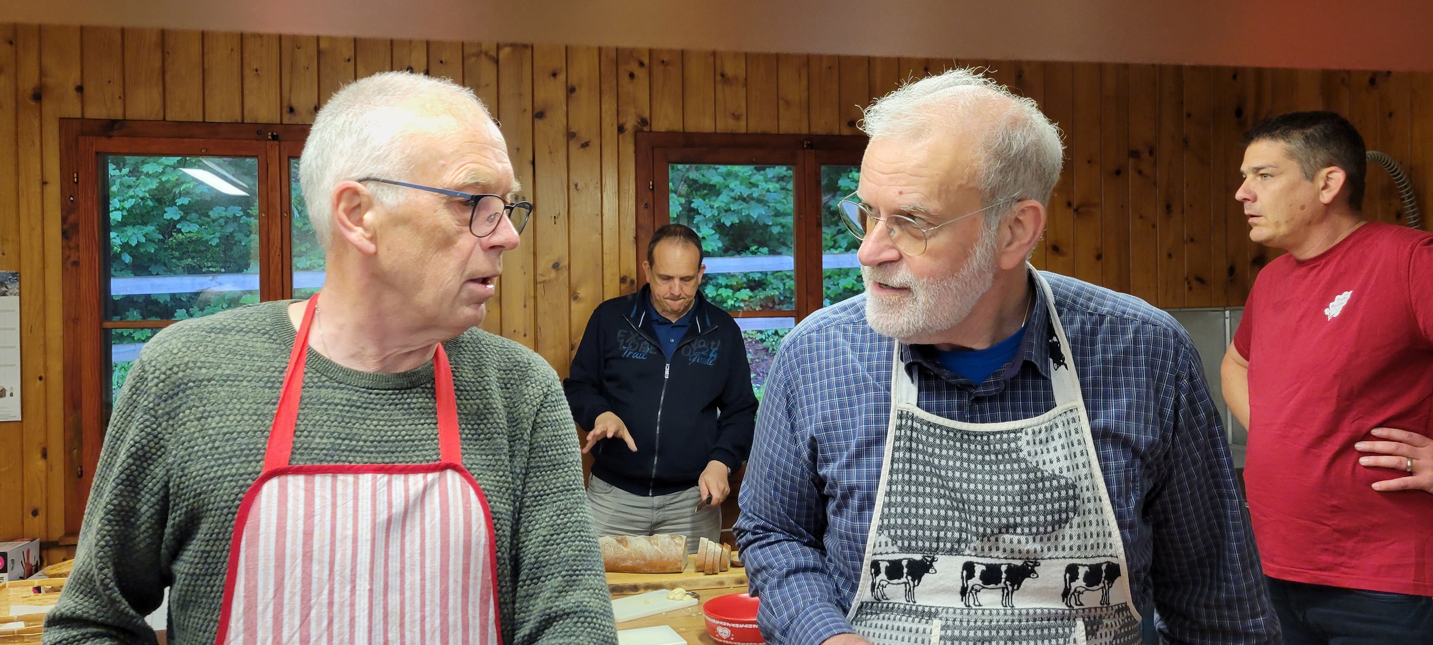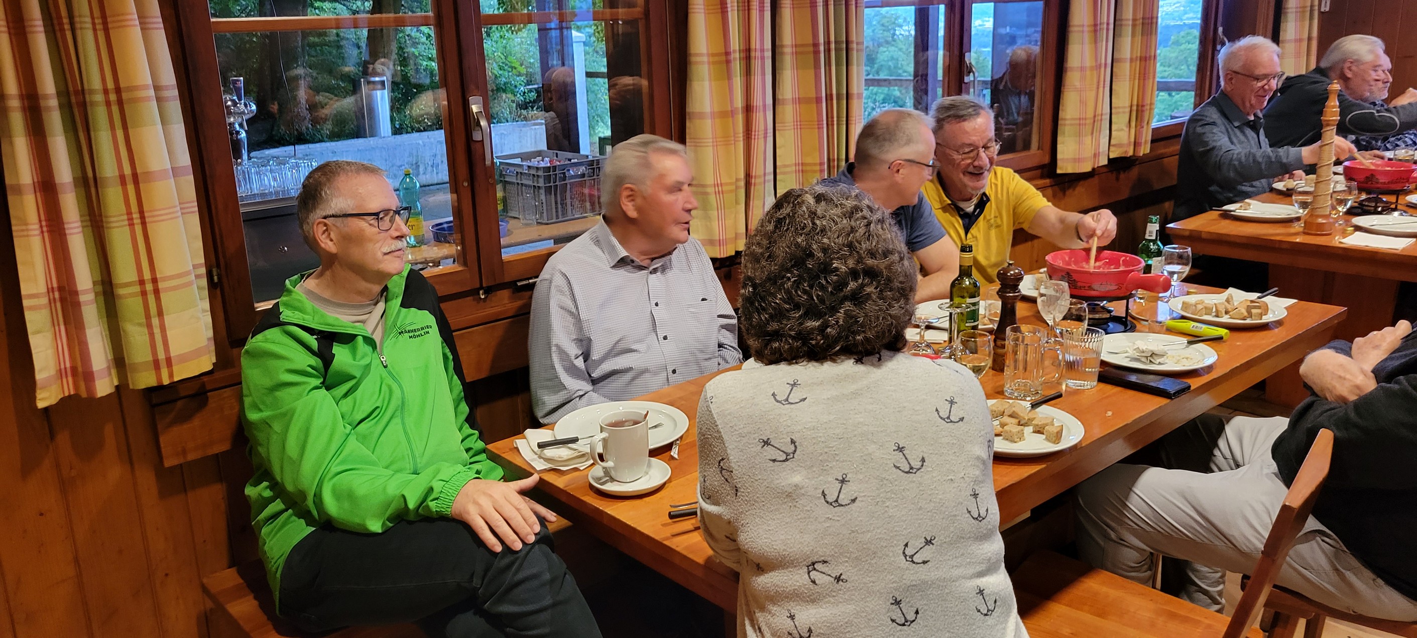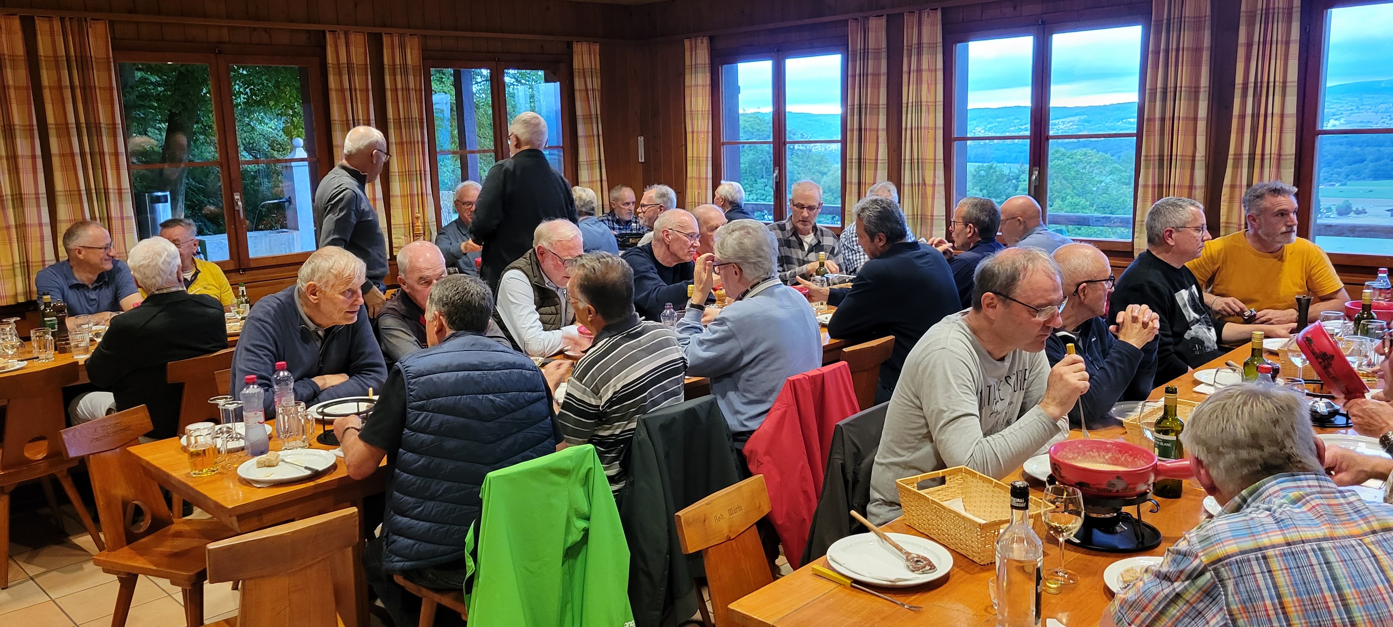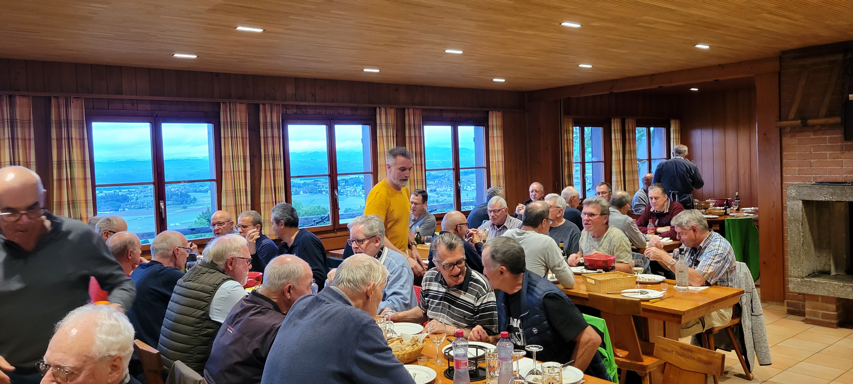 Wie es seit vielen Jahren Tradition ist, treffen sich die Helfer, die beim Anlass der Raiffeisenbank im Einsatz waren, am Mittwoch vor Auffahrt im Waldhaus. In diesem Jahr waren fast 60 Männerriegler anwesend. Die Besonderheit in diesem Jahr war, dass wir das Fest vor dem Arbeitseinsatz hatten, da das 100-Jährige Jubiläum der Raiffi erst am 13./14. Juni gefeiert wird. Und das zweite Spezielle war, dass wir schon fast zur Sommerzeit ein Käsefondue genossen. Das nasse und kalte Wetter passte aber zu unserem Essen. Zu Beginn unseres Festes wurden beim Apéro Neuigkeiten ausgetauscht, nach der aktuellen Gesundheit gefragt und vor allem der Zusammenhalt unter uns Männerriegler gepflegt. Und es bewahrheitete sich wieder: erst in schlechten / schwierigen Zeiten zeigt es sich, wie gut das Vereinsleben und die Kameradschaft funktioniert. Gegen 19 Uhr verzogen wir uns in die wärmende Stube vom Waldhaus und 4er Teams waren gefordert, der bereitstehende Käse zu einem schön geschmolzenen Fondue zuzubereiten, was natürlich allen hervorragend gelang. Die 12 Kilo Käse und 10 Kilo Brot wurden fast restlos vertilgt. Einige wenige entschieden sich, das Alternativmenu zu wählen. Der Präsi kochte im Voraus ein viel gelobtes Sugo, was natürlich mit den Spaghetti abgestimmt war. Die Vanillecornet als Dessert fanden Anklang, kein einziges blieb übrig.