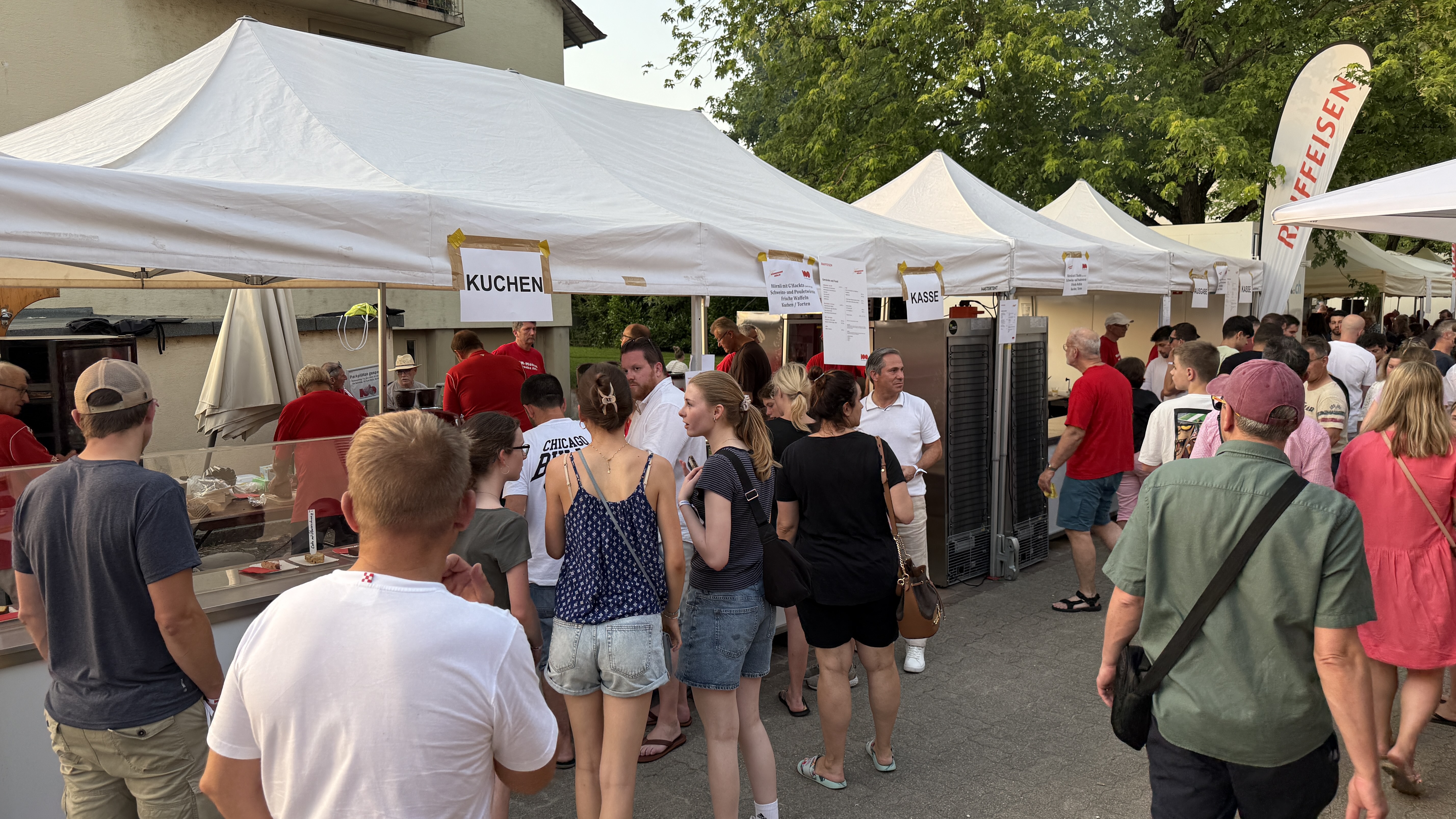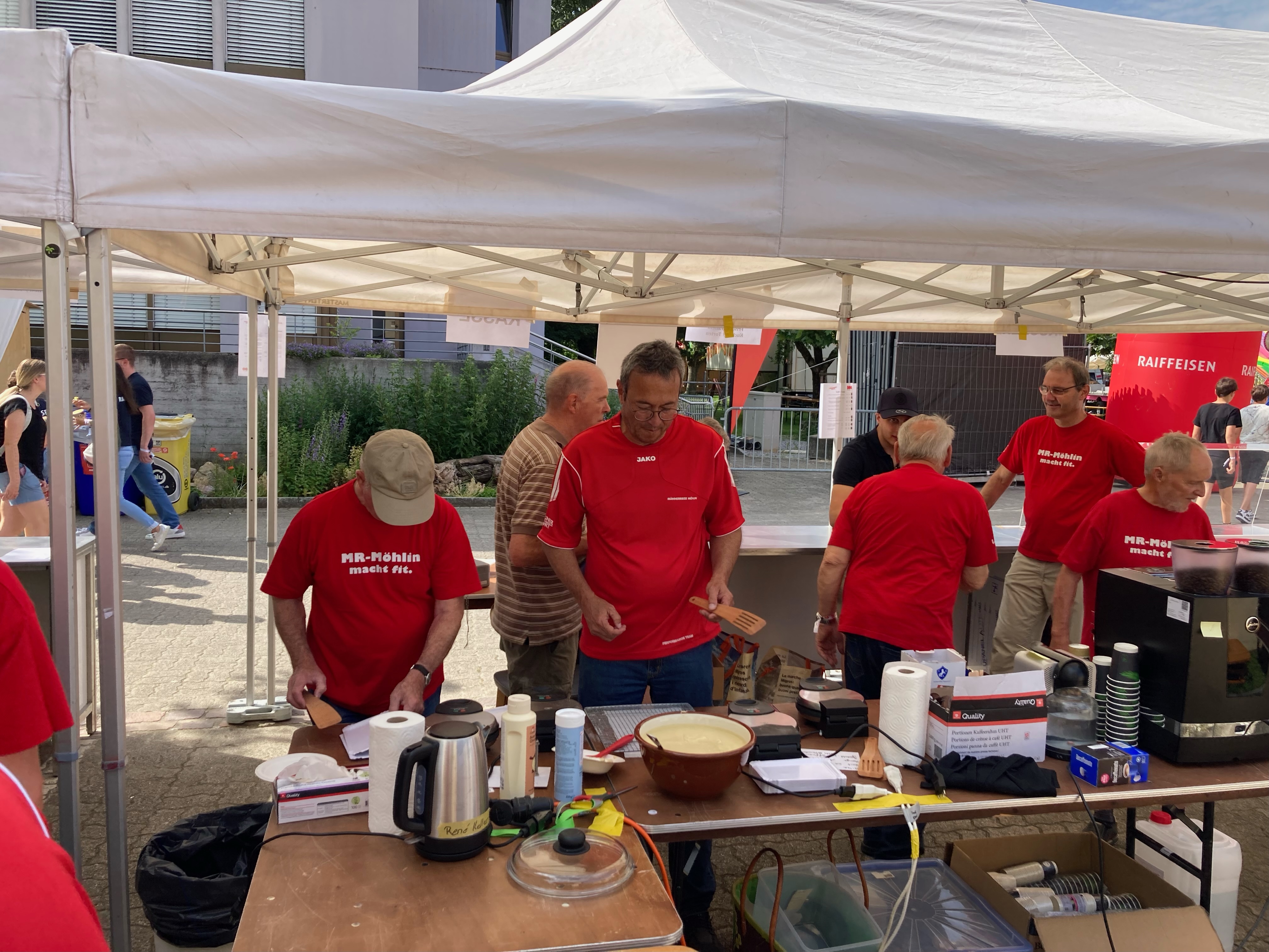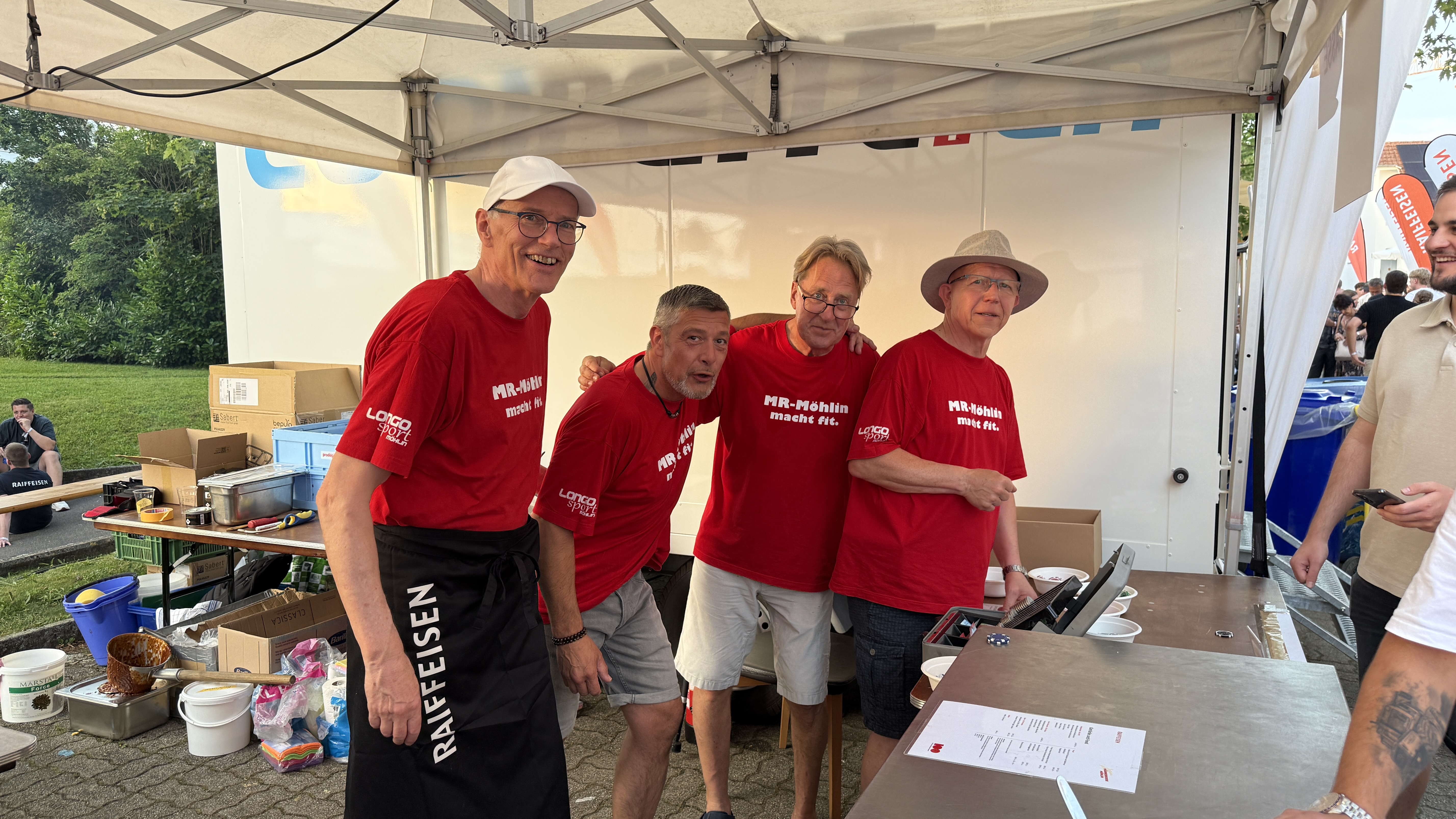 Die Männerriege hat zum 100 Jahr-Jubiläum der Raiffi Möhlin mit einem Verpflegungsstand die Gäste der Raiffeisenbank verköstigt. Hörnli mit G'Hacktem, Schweins- und Pouletwürste, warme Waffeln und ein Kuchenbuffet standen zur Auswahl. Es benötigte den Einsatz aller Männerriegler, um diesen Anlass zu stemmen. Wir durften einen heissen Sommertag geniessen, die Stimmung bei den Besuchern war durchwegs positiv, Küche und Infrastruktur funktionierten reibungslos. Und so konnte ein rundum gelungener Anlass gefeiert werden, der unserer Vereinskasse einen schönen Zustupf bescheren wird.